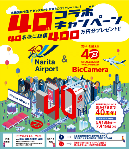 5月に創立40周年を迎えた(株)ビックカメラ(東京都豊島区、宮嶋宏幸社長)は、同じく5月20日に開港40周年を迎える成田国際空港(株)と共同で、40周年コラボキャンペーンを実施する。