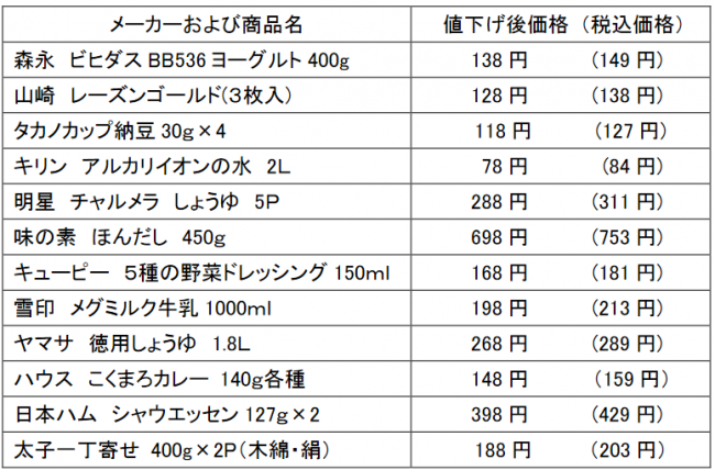 値下げ対象品は、日常使いの食料品・日用品の250品目で、値下げ期間終了後は、元の販売価格に戻すとしている。