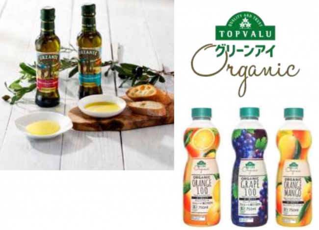 フェア企画商品には直輸入商品もある。食用油大手ウルサンテ社製造のオリーブオイル2種類(ともに227g本体価格398円)や、ヘルシー食品メーカーアルテオリバ社製造のガスパチョ(1L本体価格698円)、水産加工メーカージュスト・ロペス・バルカーセル社製造のオイルサーディン(90g本体価格238円)はイオンの直輸入商品だ。またオーガニックジュースを直接調達したトップバリュグリーンアイオーガニックジュース3品目(750㎖本体価格298円)もフェアの目玉商品として扱う。