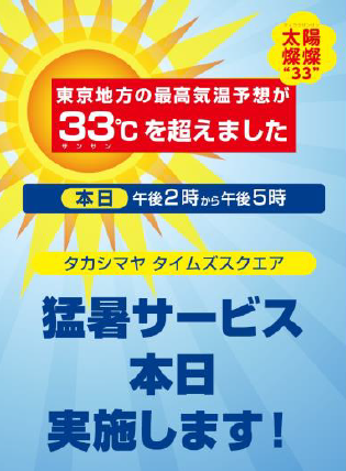 (株)高島屋(大阪府大阪市、大本茂社長)は、新宿高島屋で7月18日(水)から8月21日(火)まで、夏恒例となった「太陽 “燦燦” 猛暑サービス」を実施する。