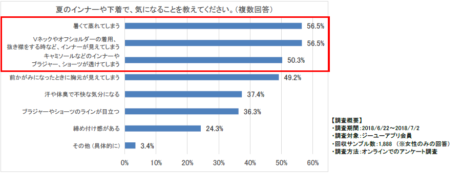 さらに、「夏のインナーや下着で、気になることを教えてください」と具体的な悩みをたずねたところ、「暑くて蒸れてしまう」(56. 5%)と「Vネックやオフショルダーの着用、抜き襟をするときなど、インナーが見えてしまう」(56.5%)が同率で最も多かった。次に多かったのが「キャミソールなどのインナーやブラジャー、ショーツが透けてしまう」(50.3%)。気温や湿度が上がるなかでの着心地に関する悩み、また、 薄着の季節ならではのインナーの見え方、透けに悩む傾向が明らかになった。