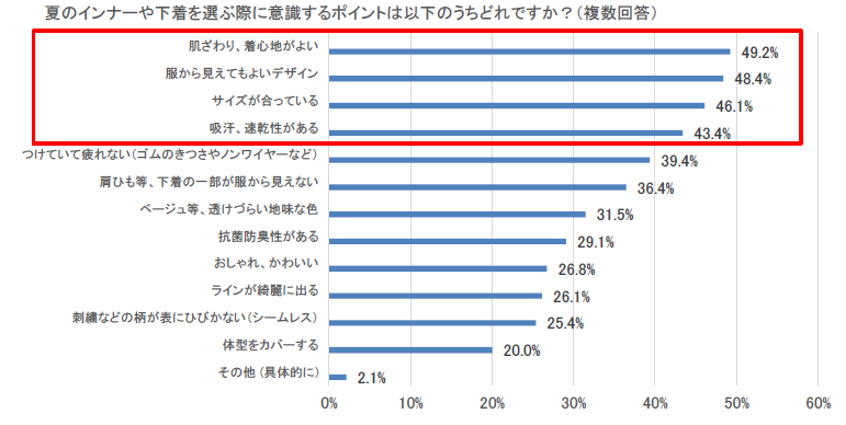 第2に、「夏のインナーや下着を選ぶ際に意識するポイントは以下のうちのどれか」という質問には、「肌ざわり、着心地がよい」(49.2%)、「服から見えてもよいデザイン」(48.4 %)、「サイズが合っている」(46.1%)、「吸汗速乾性がある」(43. 4%)といった夏特有の着心地や機能性が上位にランクインし、「ラインが綺麗に出る」(26.1%)や「体型をカバーする」(20.0%)といった補整機能性を大きく引き離す結果となった。他者からどう見られるかよりも、心地よさや快適であるための機能性を重視する傾向が明らかになった。