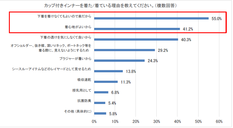 さらに、「カップ付きインナーを着た/着ている理由を教えてください」とたずねたところ、「下着をつけなくてもよいので楽だから」(55.0%)、「着心地がよいから」(41. 2%)という回答が上位に。「快適さ」を重視して、カップ付きインナーを着用している人が多いという結果が明らかになった。