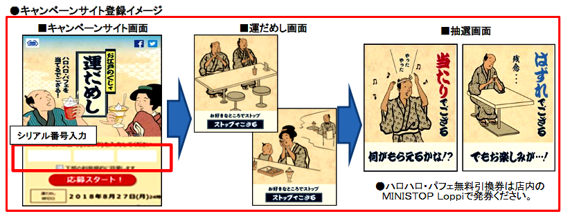 商品無料引換券の交換期間は、8月27日(月)まで。お江戸のくじで運だめし券は、8月27日(月)の24:00までチャレンジが可能だ。ハロハロ・パフェが当たった場合、店内のMINISTOP Loppiで無料引換券を発券して使用する。