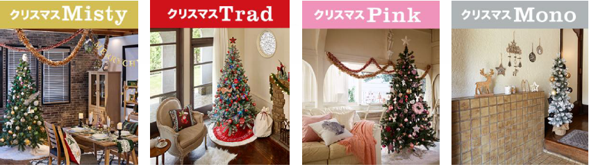 また、「Misty」「Trad」「Pink」「Mono」4つのスタイルの特大クリスマスツリー(210cm)も展示される。