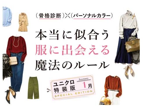 『骨格診断×パーソナルカラー 本当に似合う服に出会える魔法のルール』(二神弓子著、西東社刊)で紹介されている内容をもとに、骨格とパーソナルカラーから似合う服の素材やデザインを診断し、体の特徴に合わせたユニクロのウィメンズ商品の着こなし方を提案する。骨格診断は、身長や体型ではなく、骨格の特徴をもとに似合う洋服を知ることができる方法だ。