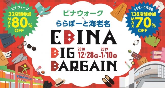 「ビナウォーク×ららぽーと海老名EBINA BIG BARGAIN」と題して、2018年12月28日(金)から2019年1月10日(木)まで展開する。両施設合わせて約170店舗が参加して、最大70~80%OFFのセールと、先着で買物券がもらえるキャンペーンなどを実施する。