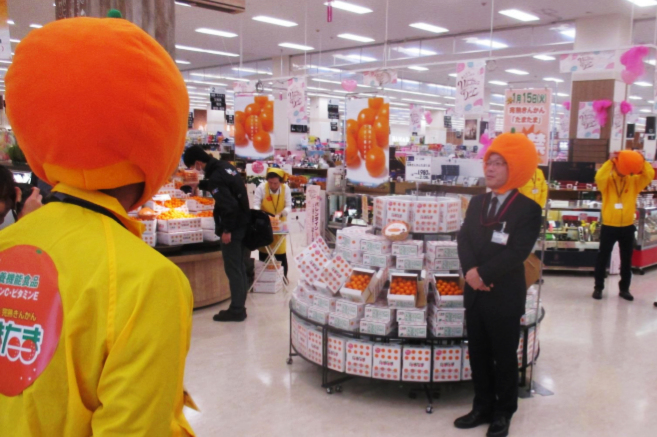 イオンスタイル宮崎では、解禁日に、JA宮崎経済連とイベントを開催した。このイベントがおもしろい。従業員がきんかんの被り物で、店頭を盛り上げた。森山店長も、率先して被り物を着用。