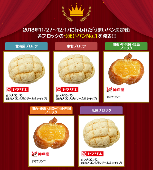 ファミマ全店を「北海道」「東北」「関東・甲信越・福島」「関西・東海・北陸・中国・四国」「九州」の5ブロックに分けて開催され、山崎製パンの「白いメロンパン(赤肉メロン入りクリーム&ホイップ)」(税込138円)が3ブロックを、神戸屋の「まるでリンゴ」(税込128円)が2ブロックを制した。