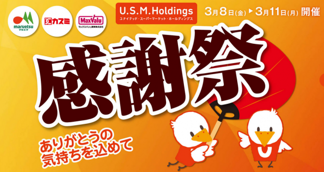 ユナイテッド・スーパーマーケット・ホールディングス(株)(東京都千代田区、藤田元宏社長)は、(株)マルエツ、(株)カスミ、マックスバリュ関東(株)3社の持株会社として、2015年3月2日に設立から4周年を迎えた。それを記念して今年も3月8日(金)~11日(月)の4日間、3社516店舗で感謝祭を開催する。