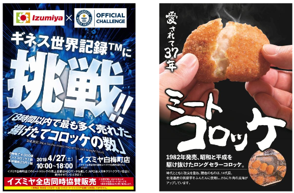 イズミヤ(株)(大阪市西成区、四條晴也社長)は、4月27日(土)に、イズミヤ白梅町店(京都市北区)において「8時間以内で最も多く売れた揚げたてコロッケ」というギネス世界記録™に挑戦する。10時の開店と同時に開始し、18時までの8時間で、ミートコロッケを4000個以上販売することを目指す。ミートコロッケは本体価格25円で販売する。