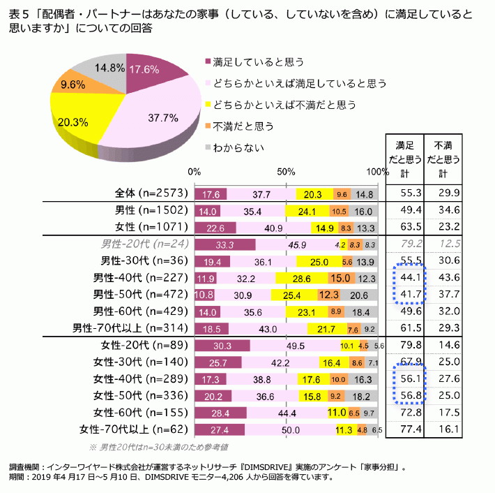 「満足だと思う」の合計は女性のほうが高く、「不満だと思う」の合計は男性のほうが高かった。ただし、男性もほぼ半数がパートナーは自分の家事に「満足だと思う」と答えている。