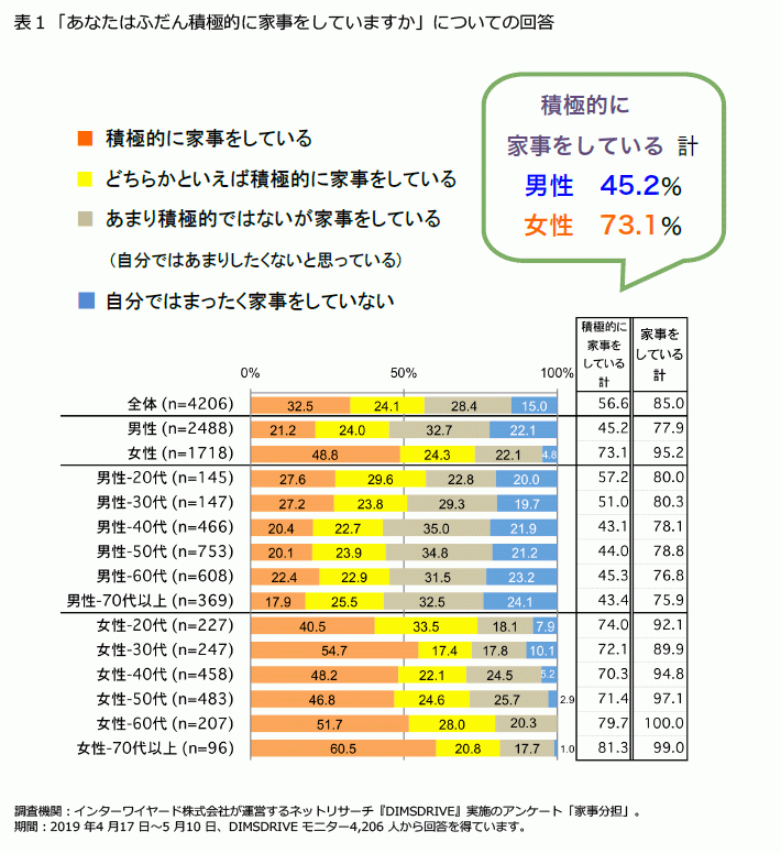 「積極的に家事をしている」の合計は女性では73.1%だが、男性では45.2%と半分に満たなかった。男性では、5人に1人以上が「自分ではまったく家事をしていない」と答えている。
