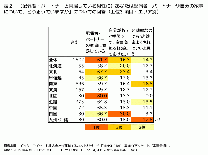 この結果には、エリアで少々温度差があった。「配偶者・パートナーの家事に満足している」で最も高かったのは「北陸」、「自分がもっと手伝って、家事負担を軽減してあげたい」では「四国」。また、どちらも2位に付けていたのが「東北」。「非効率なのでもっと効率よくやればいいと思う」では、1位が「九州・沖縄」、次いで、都市圏の「関東」「近畿」の順。