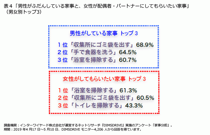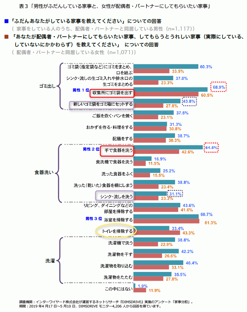 男性がしている家事は、1位が「収集所にゴミ袋を出す」、2位が「手で食器を洗う」、3位が「浴室を掃除する」。女性が配偶者・パートナーにしてもらいたい家事は、1位が「浴室を掃除する」、2位が「収集所にゴミ袋を出す」、3位が「トイレを掃除する」。