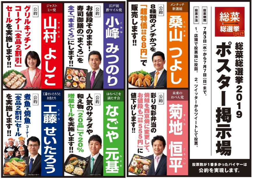 7月3日(水)から7月7日(日)の期間中、3党(3部門)が掲げた公約をお客が選んで投票する。公約はお客還元の特売だ。そして勝利した党は公約を7月31日(水)~8月4日(日)に実現しなければならない。