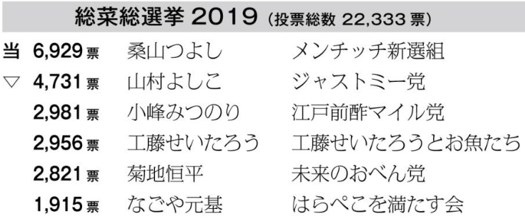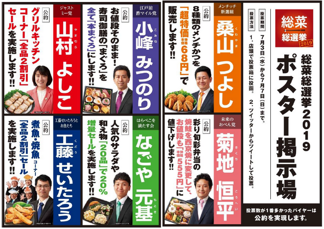 今回は総菜部門だけでなく、鮮魚、精肉の両部門も参加して6党で戦った。投票総数2万2333票のうち6929票で1位当選したのはメンチッチ新選組。公約は「8種類のメンチかつを超特価本体価格68円で販売する」だった。公約通りに7月31日(水)から8月4日(日)までの5日間、特売を実施する。