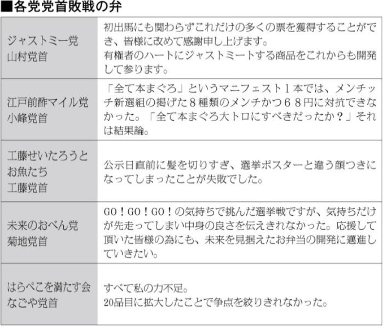 2位のジャストミート党は4731票と健闘したものの、3位以下の4党はそれぞれ3000票に届かず、惨敗である。種類を増やしすぎたり、中身の良さを伝えきれなかったりと、各党首の反省の弁はいろいろだ。これが結構面白い。サミットのノリノリ企画は相変わらず絶好調だ。