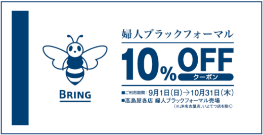 不要になった婦人ブラックフォーマルウェアを持ち込むと、1着につき「10%OFFクーポン」と交換する。髙島屋以外で購入をした婦人ブラックフォーマルウェアも回収の対象となる。回収は、1人5点までで、雑貨類は対象外になる。