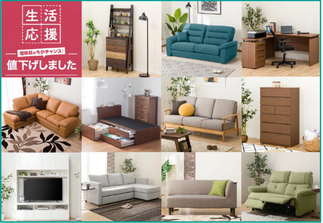 (株)ニトリ(札幌市、白井俊之社長)は、10月1日からの消費税増税前に、家具を買い替えたいというお客のニーズに応えるべく、生活応援値下げを実施する。