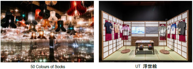 たとえば、50色のソックスに明かりを灯してランプに見立て、鏡張りの部屋でキラキラ輝かせる「50 Colours of Socks」、天井から吊るされた無数の LifeWear アイテムが万華鏡のオブジェのように見える巨大なインスタレーション・アート。青と白のグラデーションに染められた AIRism の生地でつくられたトンネルでは、滑らかでひんやりとした質感を感じとることができる。