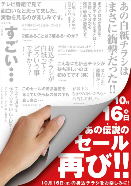 2017年10月に実施した白紙チラシによるセールは話題を呼び、平日で過去最高の売上高を達成した。白紙チラシでは、チラシ商品の内容が店舗でしか確認できないのがミソ。これが来店客数増に直結した。
