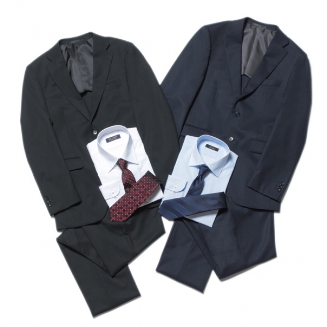 ビジネススーツ、ワイシャツ、ネクタイがそれぞれ2点ずつセットされた「メンズビジネスウェア6点セット(レギュラー標準体型モデル)」は、50点限定で本体価格1万1111円。