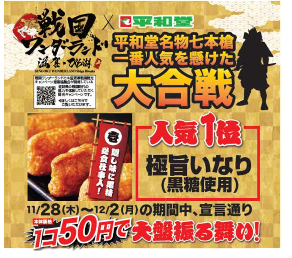(株)平和堂(滋賀県彦根市、平松正嗣社長)は滋賀県観光キャンペーン「戦国ワンダーランド滋賀・びわ湖」の関連企画として、11月14日(木)から11月20日(水)まで、惣菜の人気投票企画「平和堂名物七本槍一番人気を懸けた大合戦」を実施した。その結果が11月25日(月)に平和堂のスマホアプリ上で発表され、「極旨いなり(黑糖使用)」が人気投票1位を獲得した。