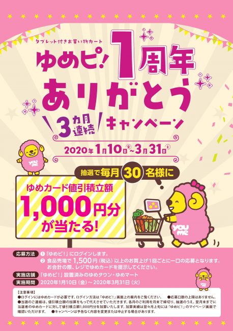 ゆめピ!カートを導入している直営売場(食品)で、ゆめカードを使って1500円(税込)以上を買上げたお客は一口の応募ができ、毎月抽選で30名に値引積立額1000円分を付与する。