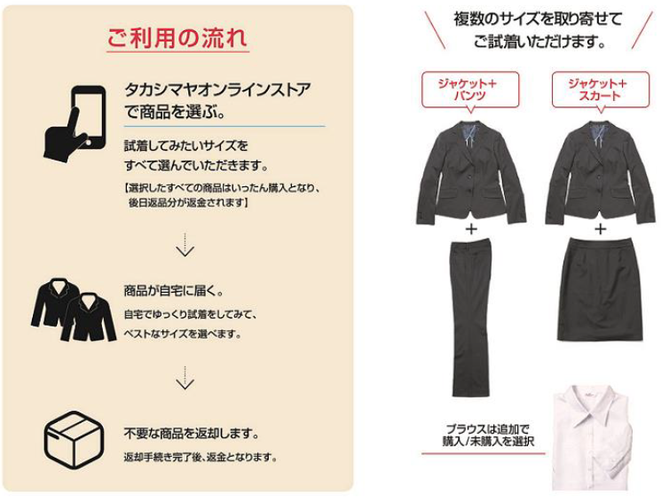 このサービスでは、さまざまなサイズのリクルートスーツの中から自分にピッタリ合った1着を選ぶことができる。また、サイズが合わなかった商品は返品自由で、返品送料もかからない。自宅に居ながらにして百貨店クオリティーのリクルートスーツを気軽に試すことができる。ただし、ブラウスは返品できない。
