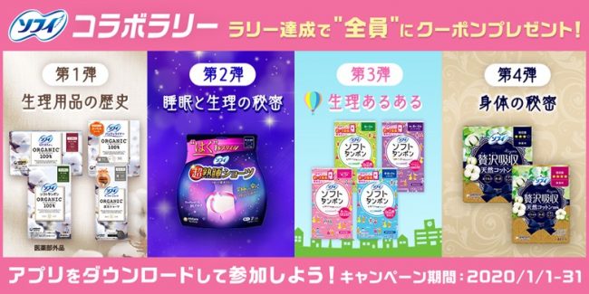 (株)スギ薬局(愛知県大府市、杉浦克典社長)は、歩数記録アプリ「スギサポwalk」を使ったユニ・チャームとのチャレンジラリー「ソフィコラボラリー」を実施する。期間は2020年1月1日(水)から1月31日(金)までの1カ月間。このキャペーン期間中、チャレンジラリーをゴールした女性全員に「生理用品のソフィ」ブランドの一部商品が割引となるクーポンがプレゼントされる。