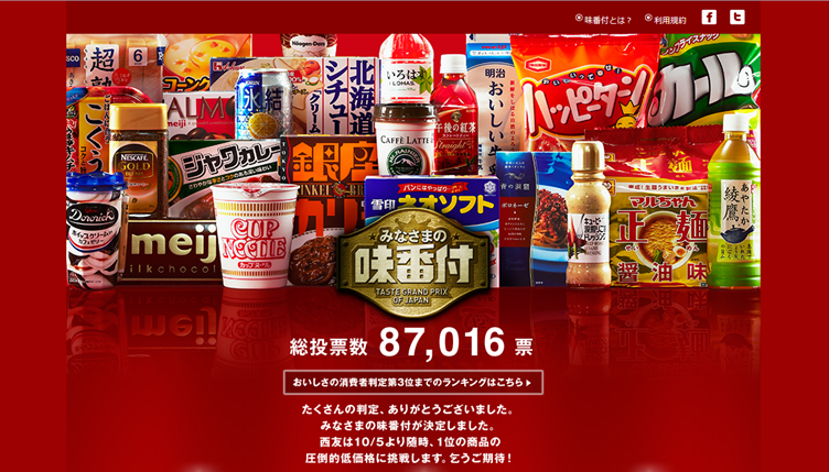8月13日から5週間、特設Webサイトで”1番おいしい”と思うものを、合計55ジャンル325商品の中からその理由とともに投票してもらった。投票総数8万7016票。