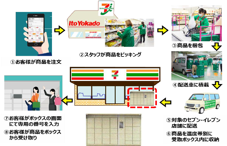 この取り組みは、事業者とお客とを結ぶ最後の区間である「ラストワンマイル」への対応策として実施する。イトーヨーカドー ネットスーパー(IYネットスーパー)で注文した商品が、セブン‐イレブン店舗に設置された専用の「受取りボックス」に温度帯別に保管され、顧客の都合のよい時間に受け取れる仕組みだ。
