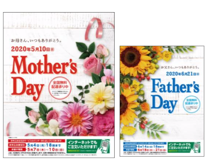 今年は、定番のカーネーションで様々な展開をする。人気の「さくら月夜」や「バンビーノ」など花の色が変化する鉢植え、艶やかな花束、そして人気のハーバリウム。また名店で美味しい食事をペアで楽しめる 「ランチ・ディナーギフト」、店舗で渡す寿司・オードブルなども、豊富に品ぞろえした。インターネット販売では、「楽天市場」と「Tポイントが貯まる 「Yahoo!ショッピング」で受付を開始する。
