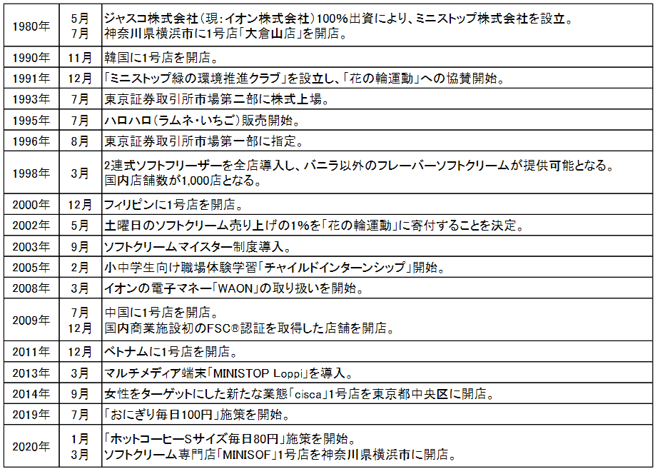 ミニストップは1980年5月21日に設立され、同7月に大倉山店(神奈川県横浜市)に1号店を出店。1993年7月には東京証券取引所市場第二部に株式上場し、1996年8月には同第一部に上場した。