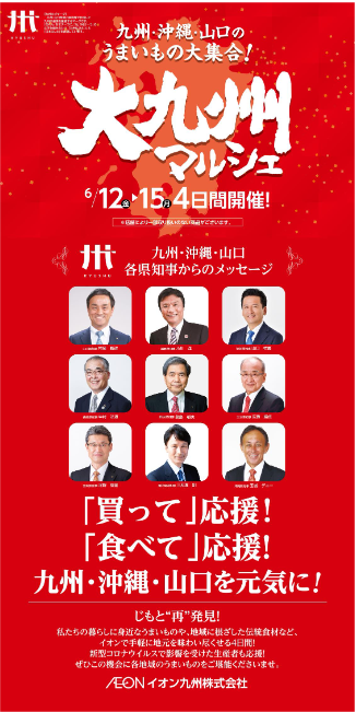 イオン九州(株)(福岡市博多区、柴田祐司社長)は、6月12日(金)~6月15日(月)の4日間、九州内の「イオン」「イオンスタイル」62店舗で九州各県のご当地食材や加工品を集めた「大九州マルシェ」を開催する。