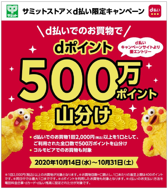 サミット(株)(東京都杉並区、服部哲也社長)は、NTTドコモと提携し、「d 払いでのお買物でdポイント500 万ポイント山分けキャンペーン」を、10 月14 日(水)から10 月31 日(土)まで、サミットストア全119店舗およびコルモピア全41店(2020年10月14日時点)で実施する。