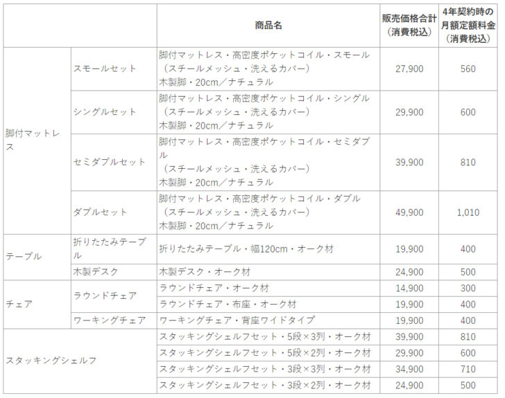 例えば、木製デスク(販売価格:税込2万4900円)は4年契約で月額500円、ワークキングチェア(1万9900円)は4年契約で月額400円で利用できる。