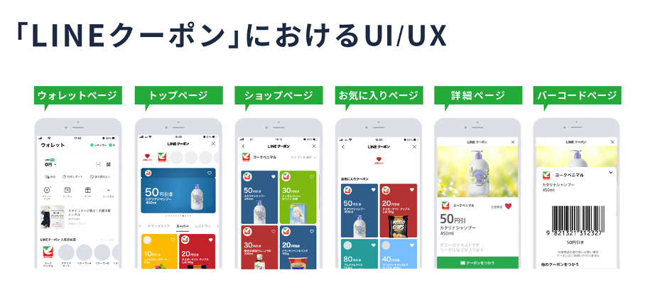 「LINEクーポン」は「LINE」アプリ内「LINEウォレットタブ」トップ画面や公式アカウントなどの流入導線でクーポンコンテンツを案内する。利用者は、商品別、小売店別でクーポンコンテンツを検索することができ、気になるクーポンを「お気に入り」ページにブックマークすることができる。使用する際には店頭でバーコードを表示し、レジでの読み取りをしてもらう。そしてクーポン金額が値引きされるという仕組みだ。