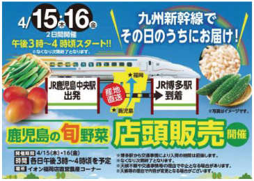 またJR九州の協力のもと、今年で開業10周年を迎えた新幹線で鹿児島県産の農産品を博多駅まで運び、イオン福岡店で2日間限定で販売する。今が旬のゴーヤ、オクラ、マンゴー、らっきょうの4品目を産地直送で提供する。