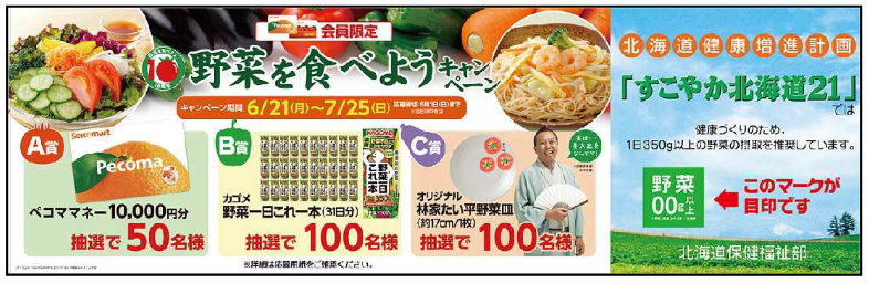 (株)セコマ(札幌市中央区、赤尾洋昭社長)は、6月21日~7月25日の期間、北海道との協働企画として「野菜を食べようキャンペーン」を実施する。北海道健康増進計画「すこやか北海道21」の一環だ。