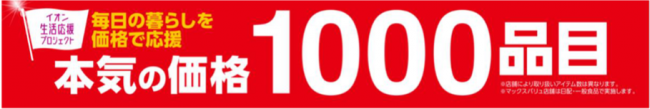 「本気の価格」の対象商品は、食料品448品目、ベビー用食料品76品目、リカー164品目、日用品597品目の合計1285品目。ただし、イオン有家店とイオン錦店では食料品の取り扱いはなく、マックスバリュではベビー用食料品や日用品は対象外となるため、販促物には「1000品目」の表記となっている。