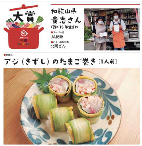 大賞に決定したのは和歌山県のJA紀州のとくし丸を利用する貴志(きし)さんの「アジ(きずし)のたまご巻き」。JA紀州では貴志さんのレシピを惣菜として採用し、今秋から順次店頭で販売を予定している。