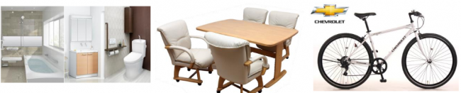 均一企画では、住まいのリフォームから、家具や自転車まで暮らしの品を展開する。例えば、TOTO 水廻り3点セット(浴室・洗面化粧台・トイレ)のリフォームは本体価格100万円 。ダイニング5点セット5万円。シボレー アルミクロスバイク2万円。