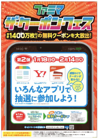ファミリーマートは1400万枚以上の無料クーポンが当たる「ファミマ ザ・クーポン・フェス」を1月4日(火)から開催しているが、その第2弾になる。