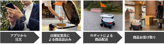 今回の実験は、ニューノーマルな生活様式に対応した非接触型の配送サービスである。顧客はアプリから注文した飲食店の商品を、自律走行ロボットに配送してもらうことによって、離れた場所でも受け取ることができる。
