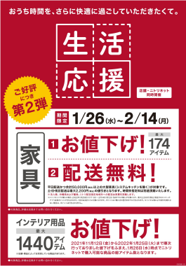 流通スーパーニュース > 販促 > ニトリnews|⽣活応援キャンペーン第二弾/家具174アイテム期間限定値下げ ニトリnews|⽣活応援キャンペーン第二弾/家具174アイテム期間限定値下げ 販促 / 2022年01月21日 ツイート (株)ニトリ(札幌市北区、武田政則社長)は1⽉26⽇から2⽉14⽇までの期間、⽣活応援キャンペーン第⼆弾として、家具カテゴリーで「174アイテムの期間限定値下げ」および「配送料無料」を実施する。第一弾は2021年11⽉13⽇から2022年1⽉11⽇の期間に実施され、顧客からの好評を得た。 また、インテリア⽤品最⼤1440アイテムの⽣活応援値下げについては、期間を設けず、恒久的な値下げを実施する。 ツイート