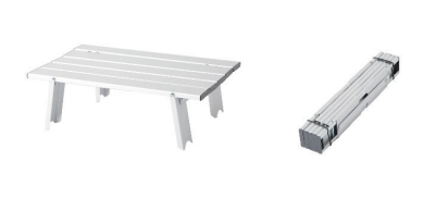 「アルミ折りたたみテーブルミニ(税込み2178円)」。規格は幅35×奥行き35×高さ20cm(組み立て後)。天板耐荷重30kg