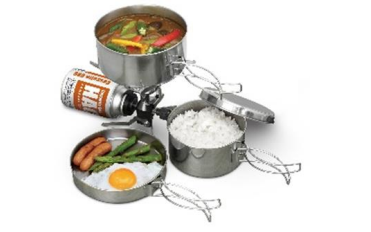 「モンターナ アウトドアクッカー4点セット(税込み1518円)」。付属品:鍋(大)、鍋(小)、フタ兼用フライパン、フタ兼用皿、収納袋