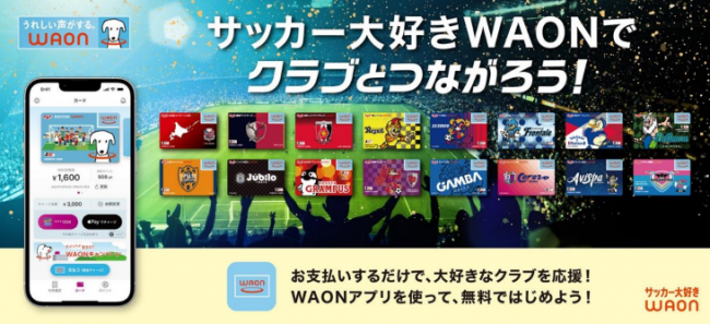 昨年10月に「WAON」アプリを開始以降、アプリ内での「ご当地WAON」の発行が広がっている。4月27日(水)から、「WAON」アプリを通じて、47種類ある各クラブチームの「サッカー大好きWAON」が、全国どこからでも発行できるようになる。これにより、ホームタウンが所在する店舗に行かなくても、応援するチームの「サッカー大好きWAON」の発行が可能になる。「サッカー大好きWAON」は、利用金額の一部がホームタウンの活性化やクラブチームの成長に役立てられる。